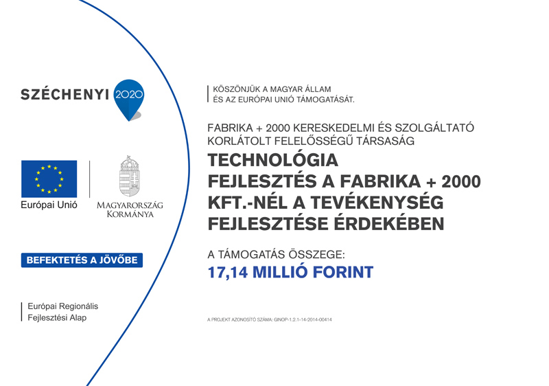 Európai Uniós forrás segítségével az eszközpark bővítésére került sor a Fabrika + 2000 Kft. telephelyén, a GINOP-1.2.1-14-2014-00414 pályázat keretén belül. A Széchenyi 2020 Mikro-, kis- és középvállalkozások termelési kapacitásainak bővítése című pályázati kiírására benyújtott projekt 35% mértékű, 17,14 millió Forint támogatásban részesült.